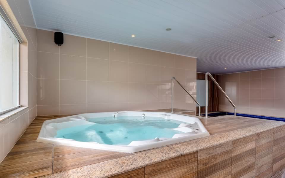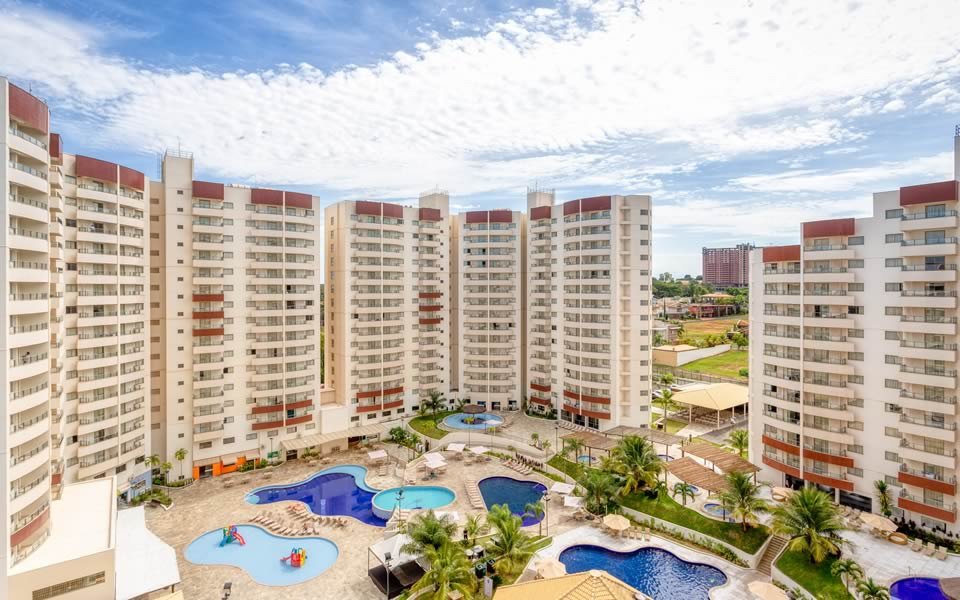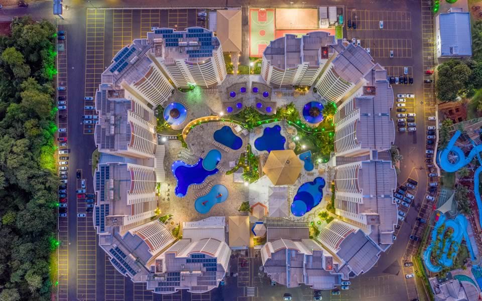 Lazer Incomparável: Um complexo aquático com 11 piscinas climatizadas, incluindo opções cobertas, ofurôs relaxantes, saunas, academias, quadras de tênis e poliesportivas.